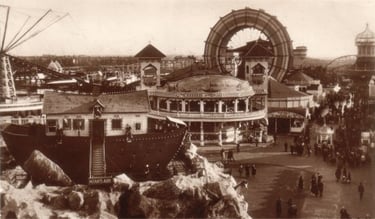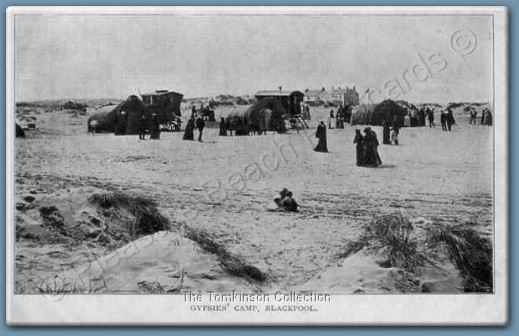 By the turn of the century the developing fairground also provided work for the gypsies. The tourists of the day favoured the traditional gypsy art of fortune telling. Gipsy Sarah Boswell who lived to a great age and is buried in Blackpool Cemetery, was reputed to possess "second sight". Apart from the Boswells, other principal families were the Lees, Youngs, Greys, Smiths, Franklins and the Herons. This card shows the gypsy camp, a combination of caravans and tents made of wattle hurdles covered with blankets, with the Star Inn in the distance. By 1910 the camp had gone, the gypsies being driven out by increasingly prosperous South Shore residents and the developing Pleasure Beach. At one time this part of South Shore was home to 300 to 400 gypsies.