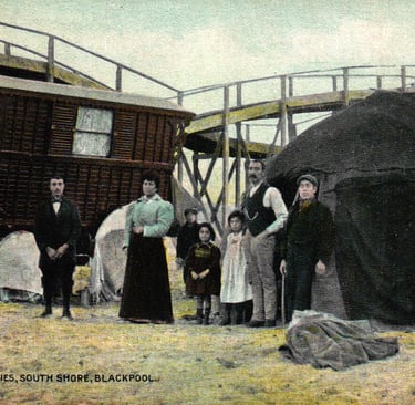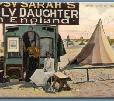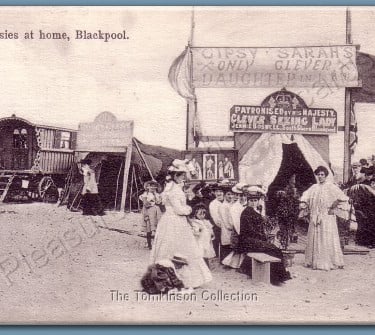 A South Shore Estate card, posted at 8:15p.m. on 25th July 1907, entitled 'Gipsies at Home, South Shore, Blackpool. The tent belongs to Jenny Boswell, 'Gypsy Sarah's ONLY Clever Daughter-in-Law' a very popular lady if the queue is anything to go by! The message on the back reads 'David and Wilfred are longing to see you to tell you of their exploits. The card was sent to an address in Swansea.