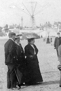 A general view of the camp from the south west. The tower of Holy Trinity Church, South Shore is visible over the houses. The 'sheds' containing the grottoes for the River Caves ride are visible on the left of the picture, just below the barely visible arms of the Sir Hiram Maxim Captive Flying Machines. There are a couple of Gypsy caravans in the distance.