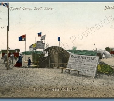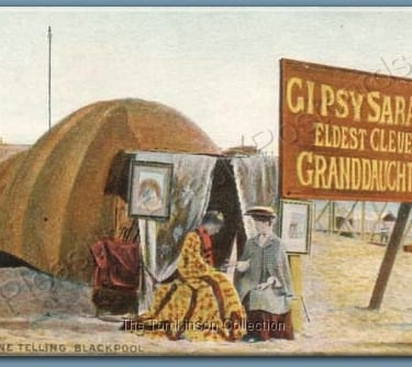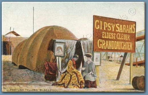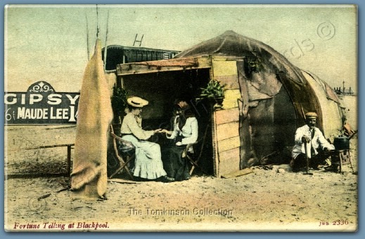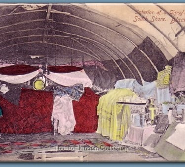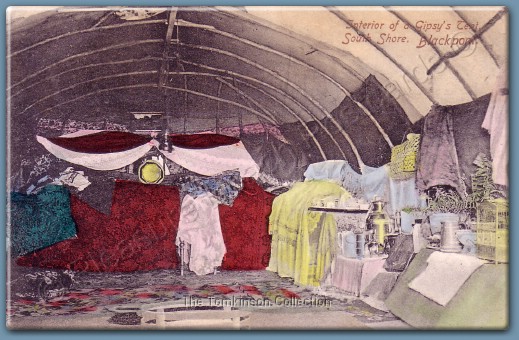 Credited to C.J.E Coop, Blackpool, this postcard is titled "Interior of a Gypsy's Tent, South Shore, Blackpool