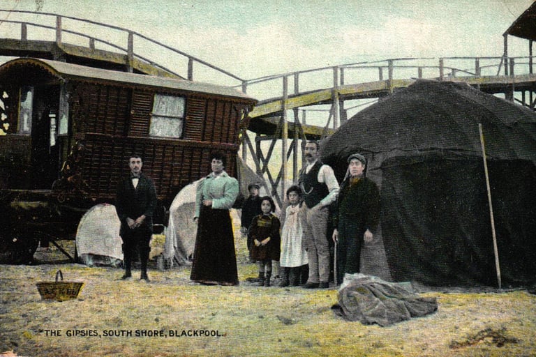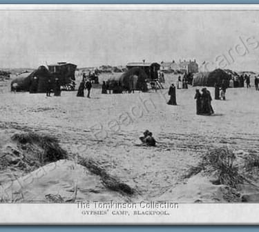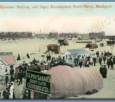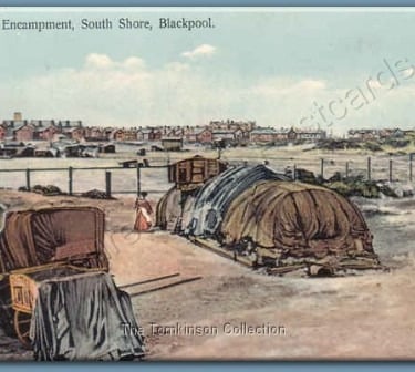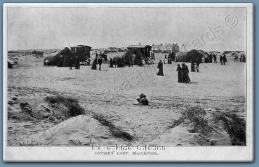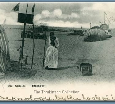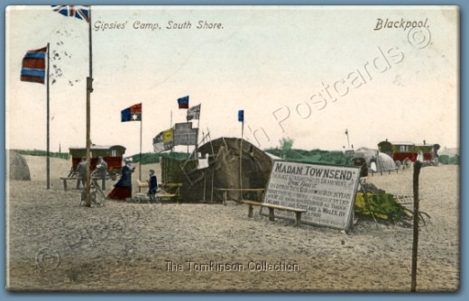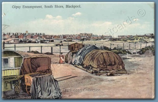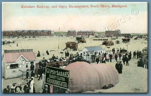 Very rare card of 'The Gipsies, South Shore, Blackpool' caravan, tent and the switchback railway in view, this is a 'Progress Series' card from E.R.G.