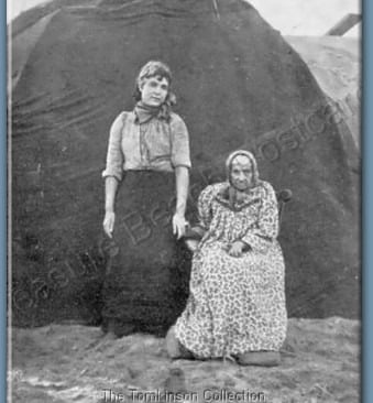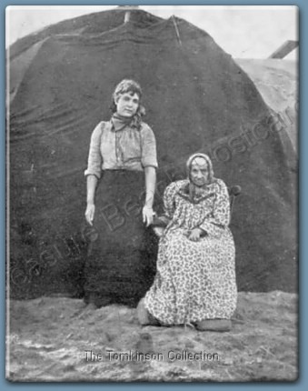 A photograph by Burns and Ashton, Victoria Pier, Blackpool, entitled 'Sarah Boswell ("Gypsy Sarah") aged 99, and her grand-daughter'. Behind them is a traditional gypsy tent, made from wattle hoops covered with blankets.